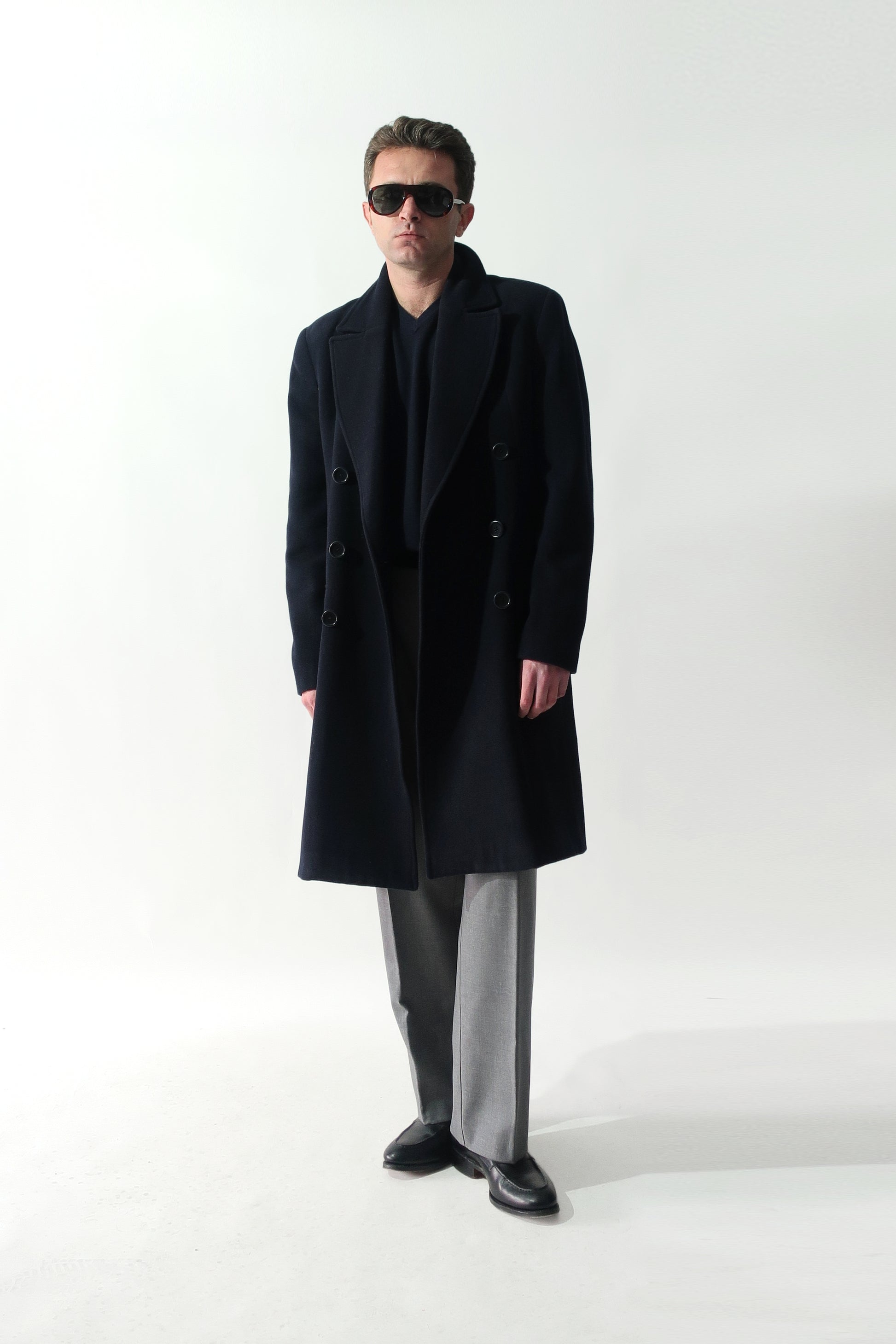 Abrigo cruzado 6 botones con cinturón, corte clásico con finas hombreras, solapas de 11 cm, suave entallado y largo.