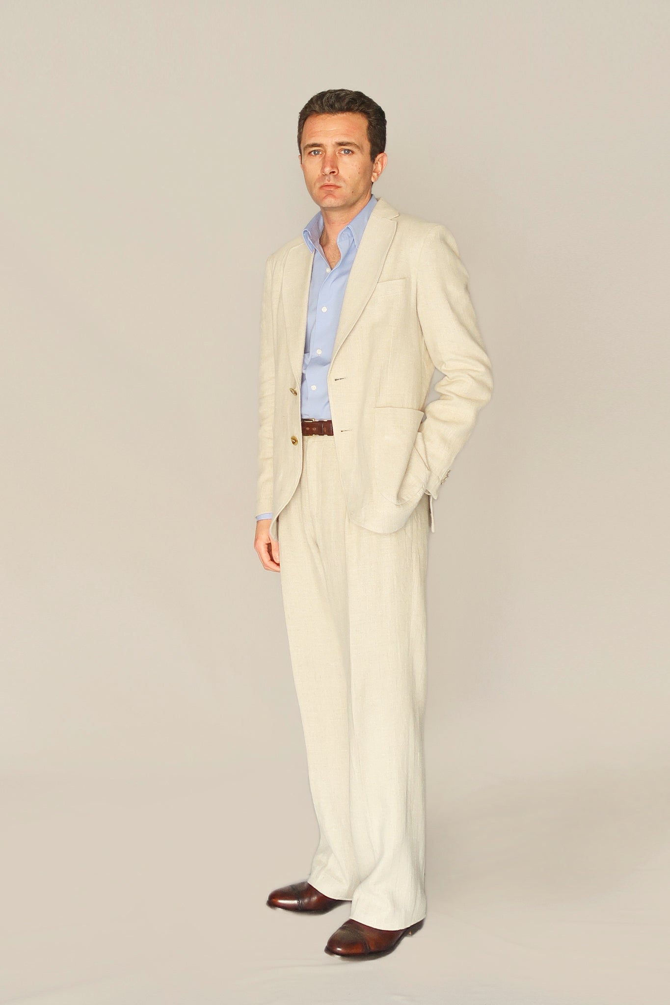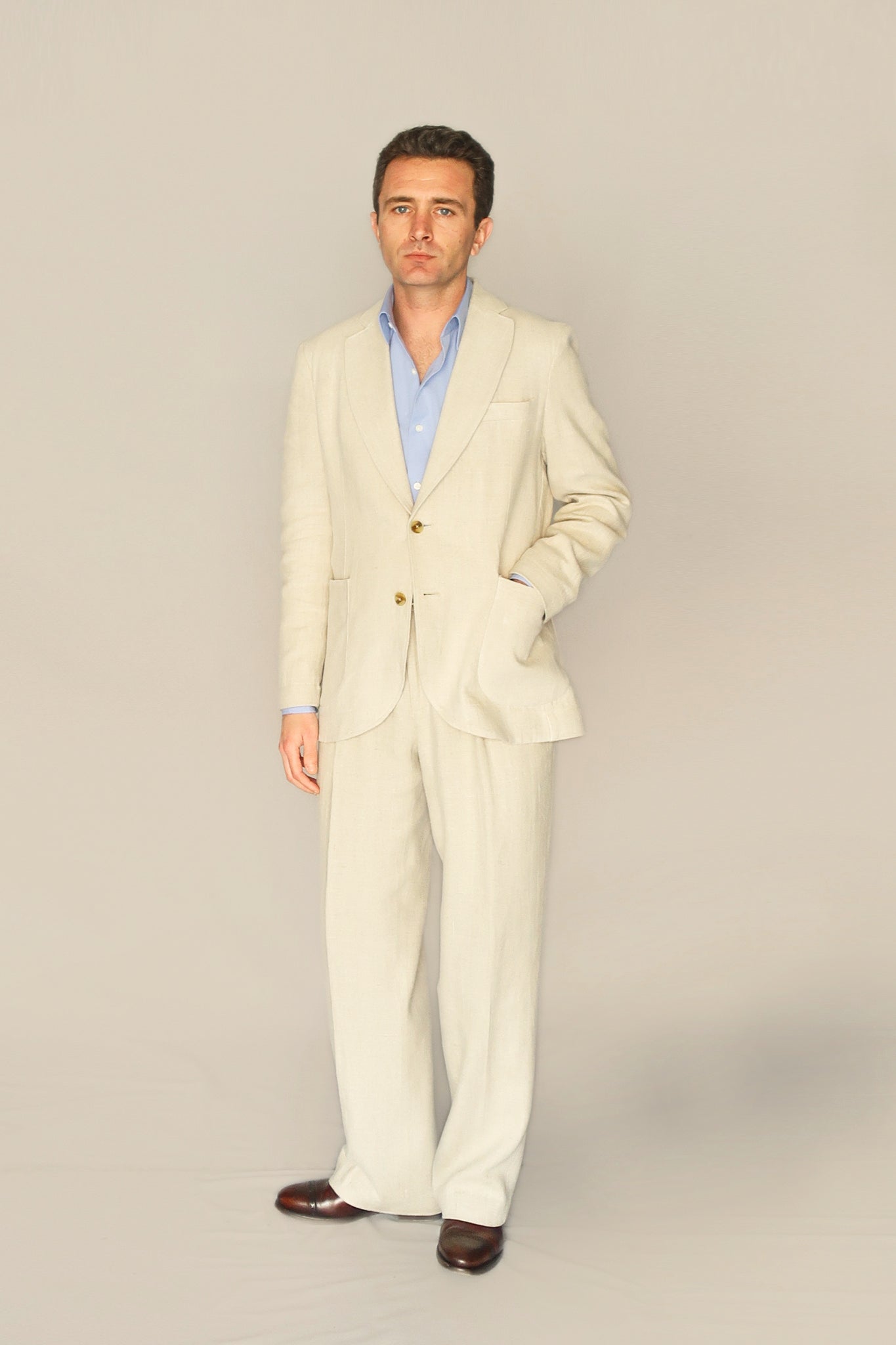 Americana recta dos botones lino. Corte clásico, ligeramente entallado, completamente desestructurada.