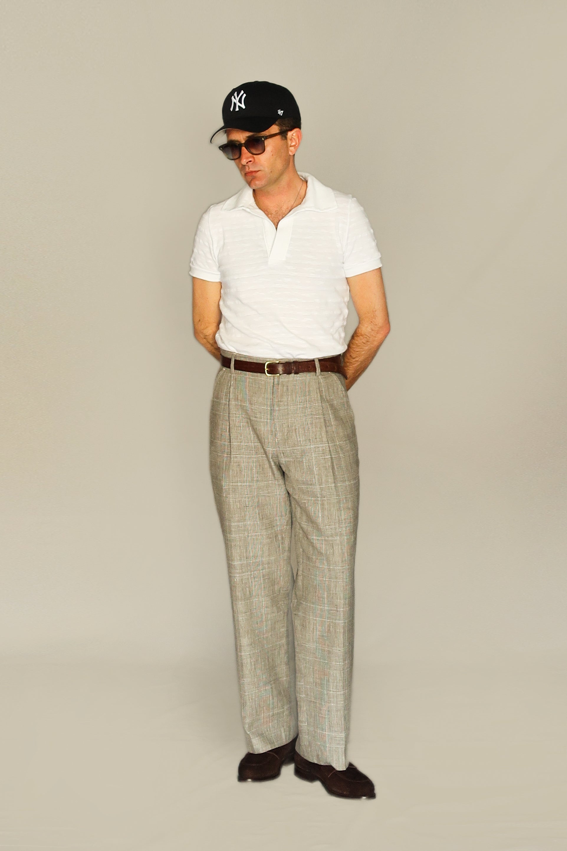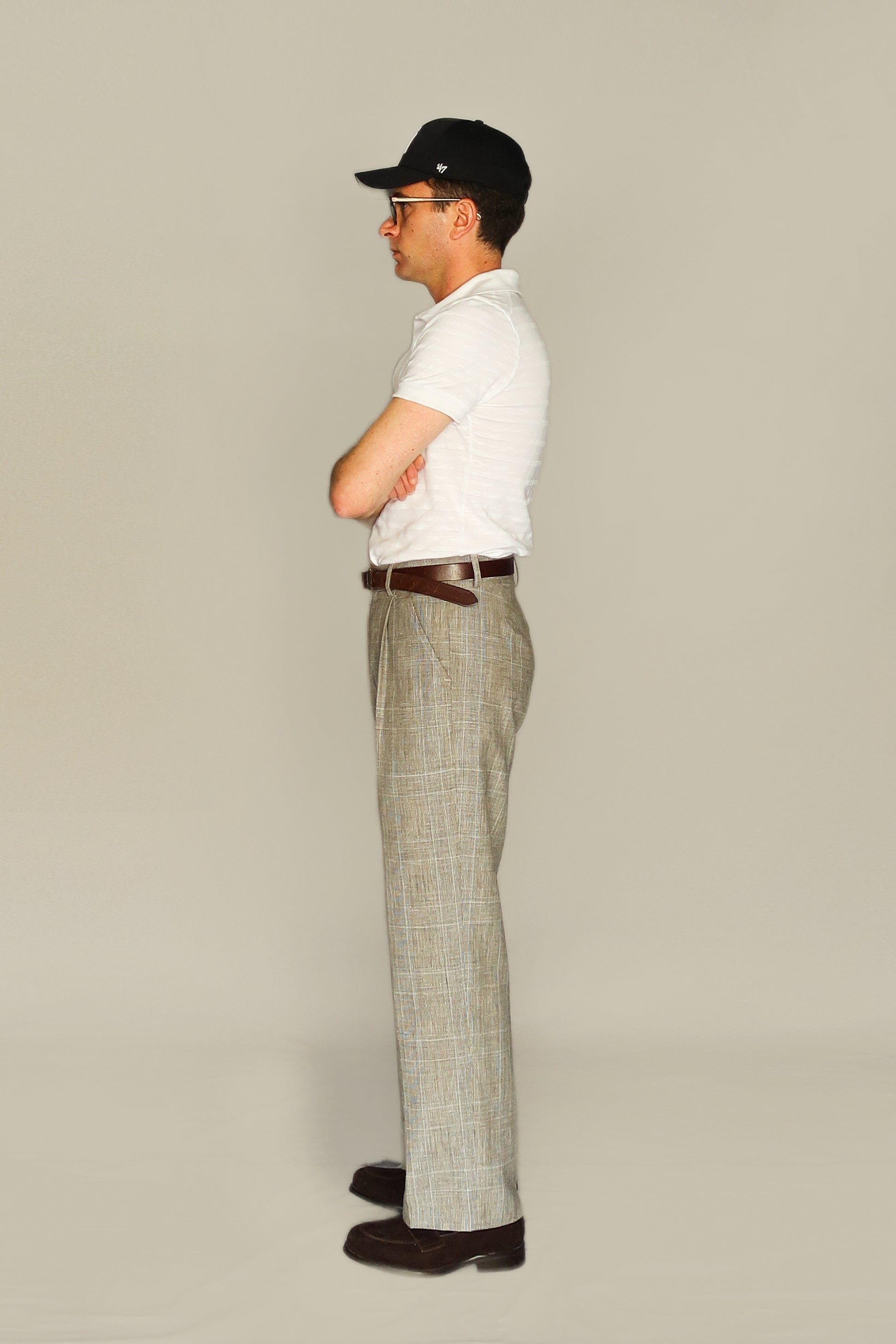 PANTALON TALLE ALTO CUADROS - ALGODÓN/LINO BEIGE Y GRIS